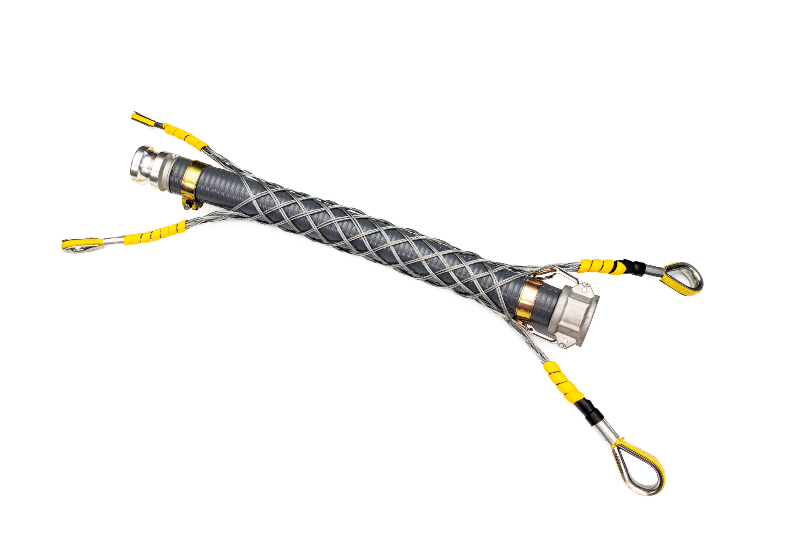 Use with hydraulic systems or to restrain high pressure hoses dispensing water, air, sand, steam, concrete and other materials.