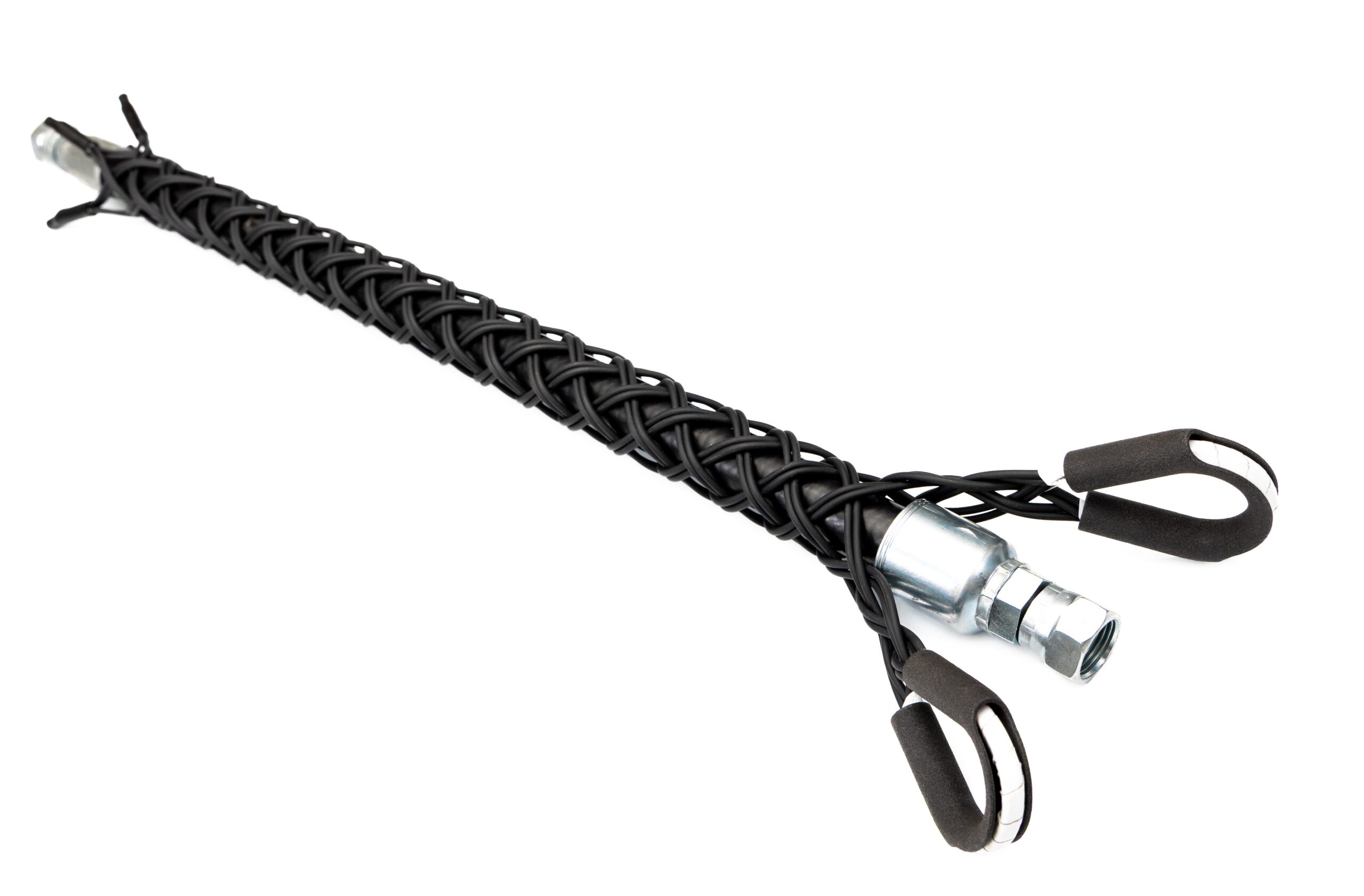 Use with hydraulic systems or to restrain high pressure hoses dispensing water, air, sand, steam, concrete and other materials.